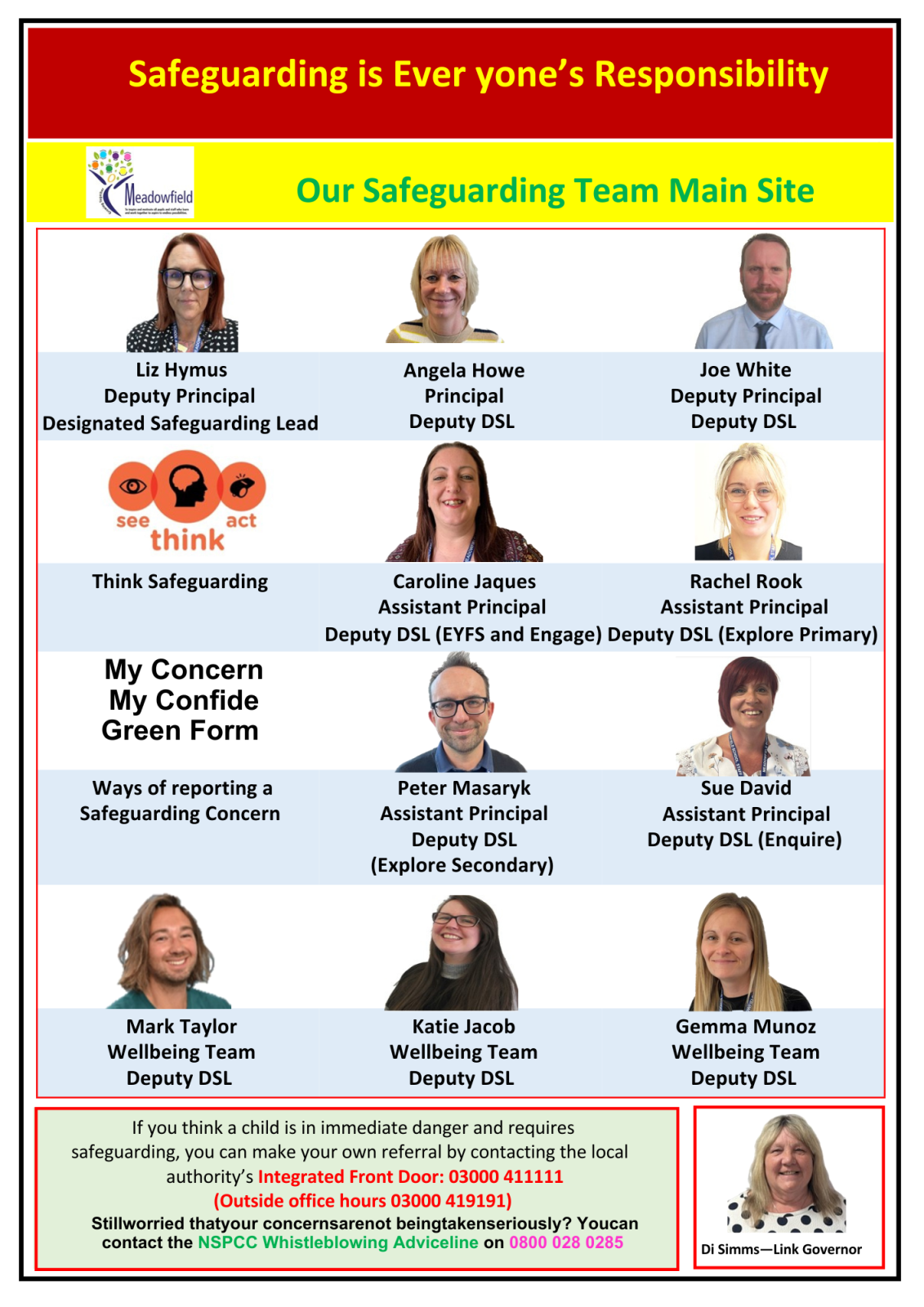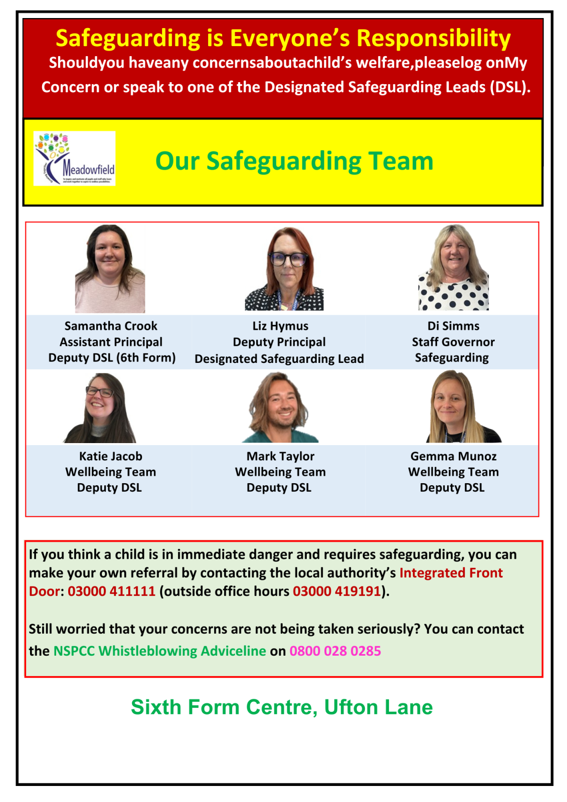 If you have any serious concerns about your child or any other student at Meadowfield School please do not hesitate to contact a member of the Safeguarding Team who will be able to provide you with the best advice and help using the appropriate degree of confidentiality.